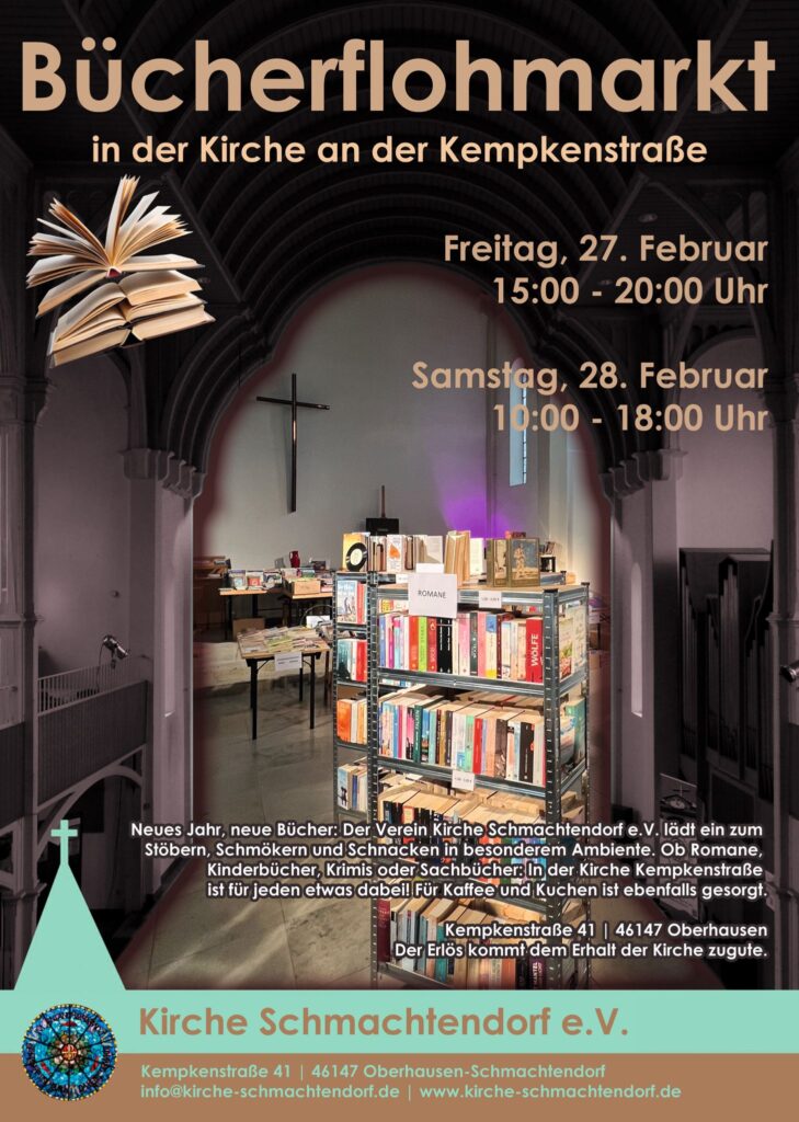 Auch im neuen Jahr gibt es wieder interessante Angebote rund um die Kirche Schmachtendorf. Musikalisch wird es voraussichtlich im März werden (Ankündigung folgt) und im Februar starten wir mit einem „neuen“ Büchersortiment in den Bücherflohmarkt, der deshalb auch für Sie bestimmt die ein oder andere Überraschung bereithält.